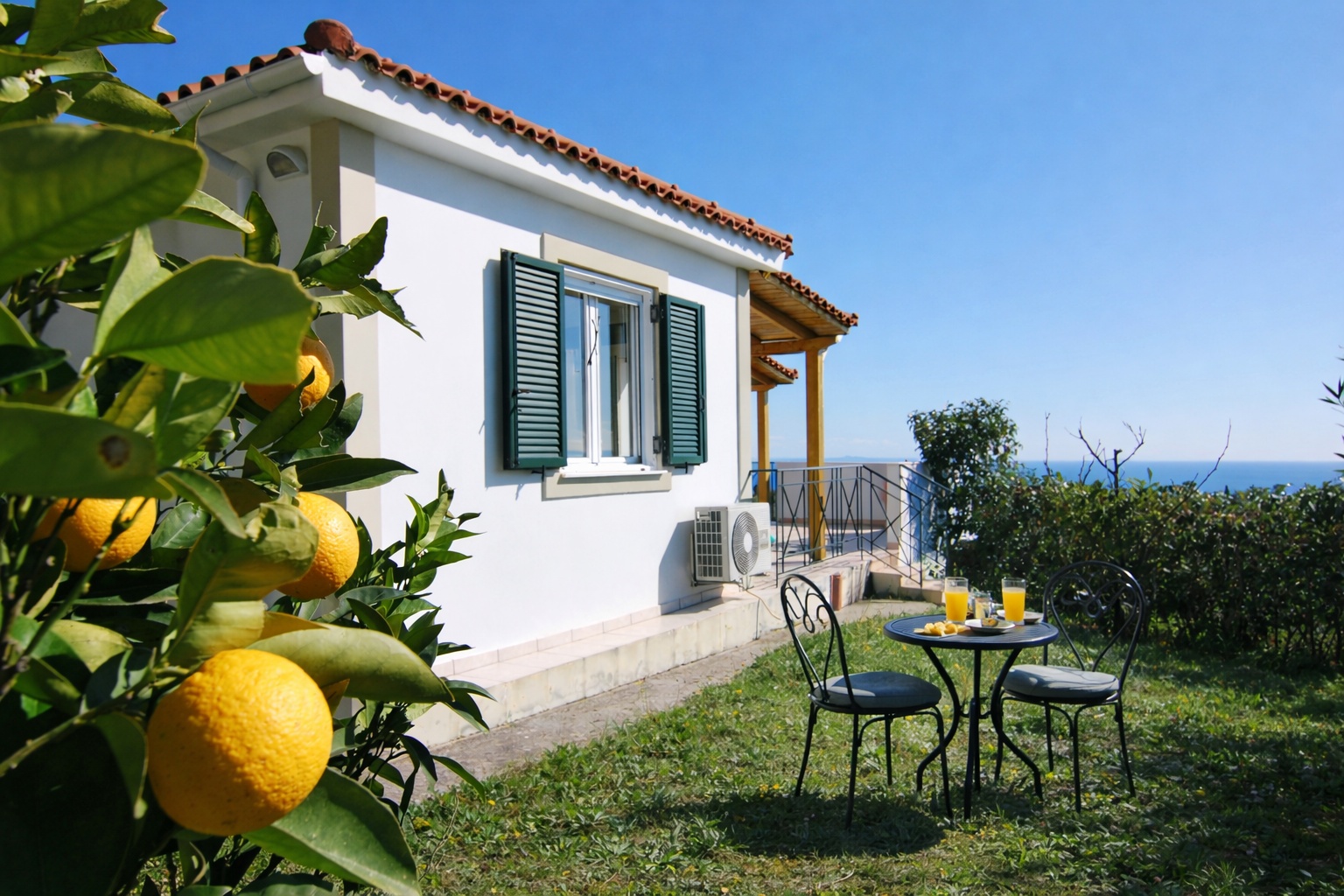 Der Außenbereich der Villa Aniley ist ein Rückzugsort mit besonderem Charme. In Alleinlage im Grünen genießen Sie absolute Privatsphäre und einen fantastischen Meerblick von der großzügigen Terrasse. Die vollüberdachte, angenehm beschattete Terrasse bietet zu jeder Tageszeit den passenden Platz – Sonne oder Schatten ganz nach Wunsch. Vier hochwertige Sonnenliegen, eine stilvolle Loungesitzgruppe sowie ein großzügiger Esstisch schaffen den perfekten Rahmen für entspannte Stunden unter freiem Himmel.